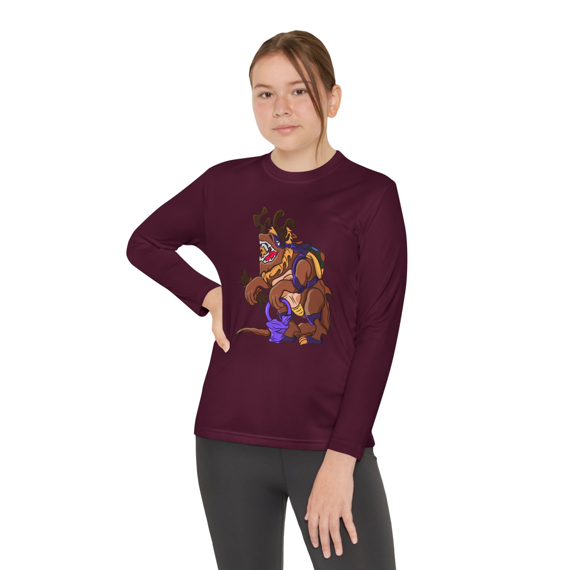 The Youth Long Sleeve Competitor Tee features a fun 'Trick or Tarrasque' design, perfect for Halloween enthusiasts. Made from 100% moisture-wicking polyester, this tee is ideal for any physical activity. Its athletic fit and extra light fabric make it comfortable for everyday wear. Suitable for kids and teens looking to embrace the spooky spirit of Halloween.