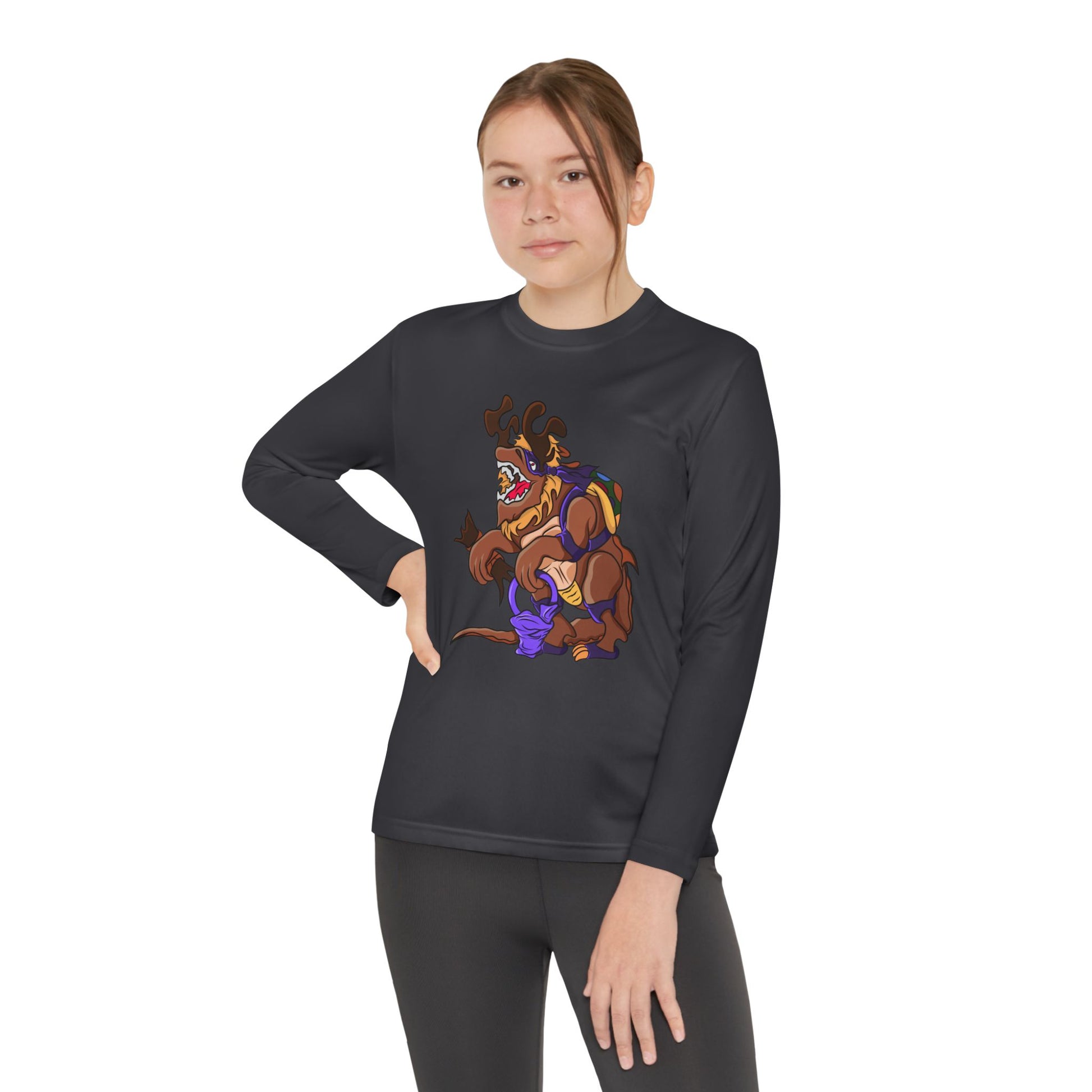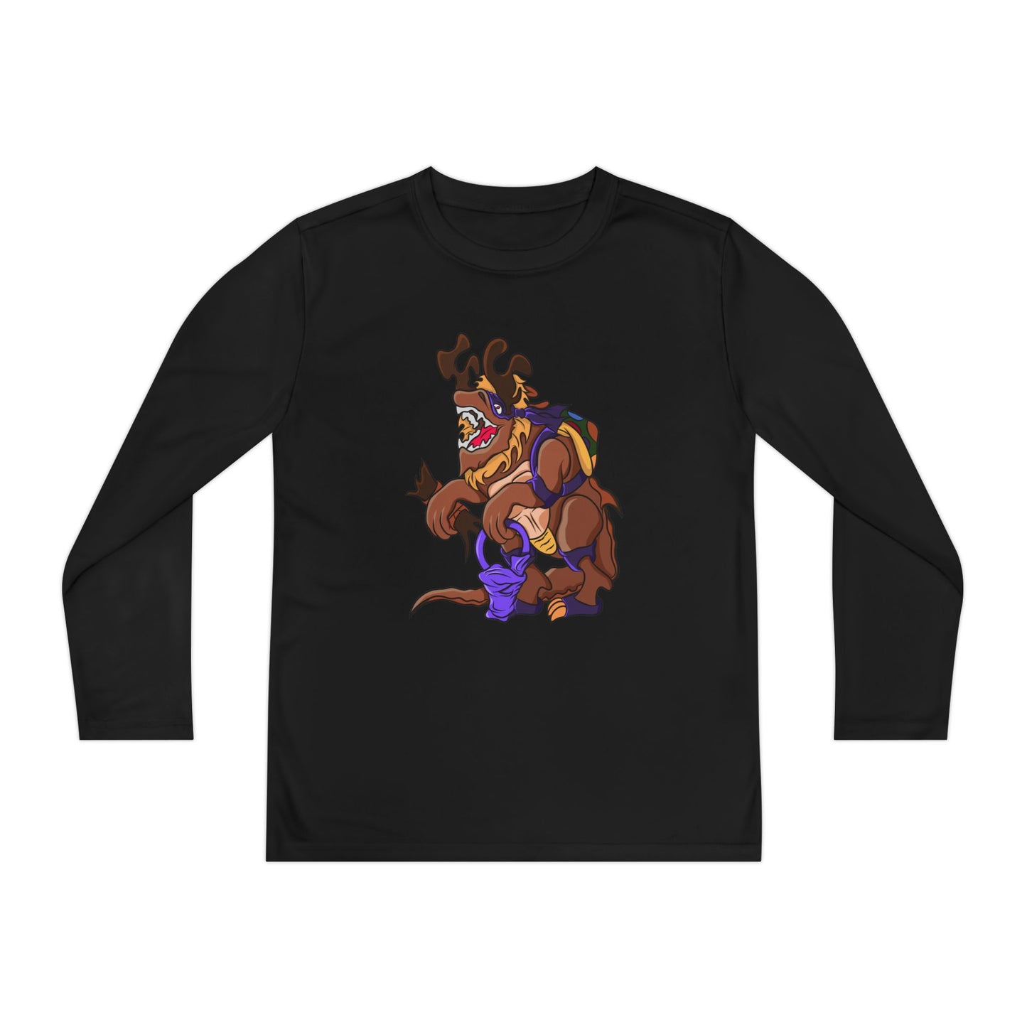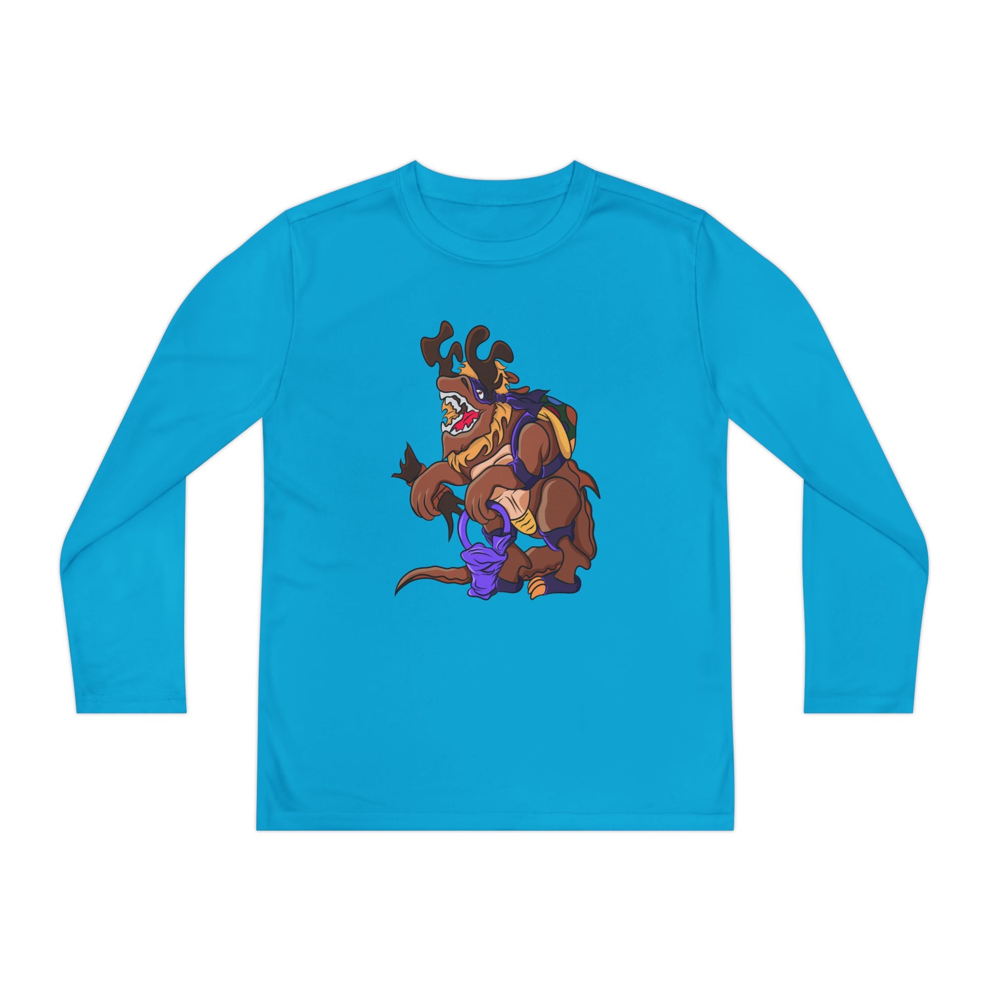 The Youth Long Sleeve Competitor Tee features a fun 'Trick or Tarrasque' design, perfect for Halloween enthusiasts. Made from 100% moisture-wicking polyester, this tee is ideal for any physical activity. Its athletic fit and extra light fabric make it comfortable for everyday wear. Suitable for kids and teens looking to embrace the spooky spirit of Halloween.